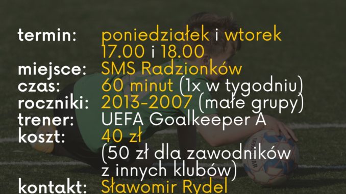 Rok szkolny rozpoczął się na dobre, więc zaczynamy nabór do Szkoły Treningu Bramkarskiego. Zajęcia będzie prowadził Trener UEFA Goalkeeper A – Sławomir Rydel – w Polsce trenerów z taką licencją jest tylko 27! W każdej grupie będą maksymalnie 4 osoby (przynależność klubowa nie ma znaczenia). Treningi będą się odbywały w poniedziałek i wtorek (w zależności od ilości grup). Zapisy pod numerem telefonu 604 944119. Zajęcia już o tego tygodnia